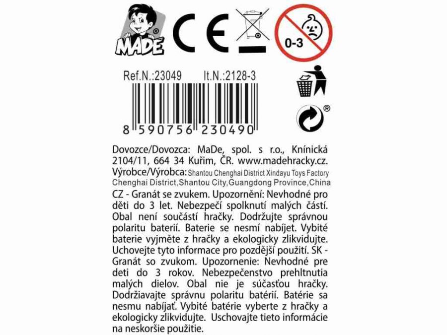 Tento ruční granát s zvukem a světlem je ideální hračkou pro kluky od 3 let. Dodává se v display boxu a obsahuje 2 baterie typu AG13. Výška boxu je 29 cm, šířka 23 cm a hloubka 22 cm. Hračka je vyrobena z plastu a má rozměry 9 x 7 cm. S jednou barevnou variantou je skvělým doplňkem do hračkářství.