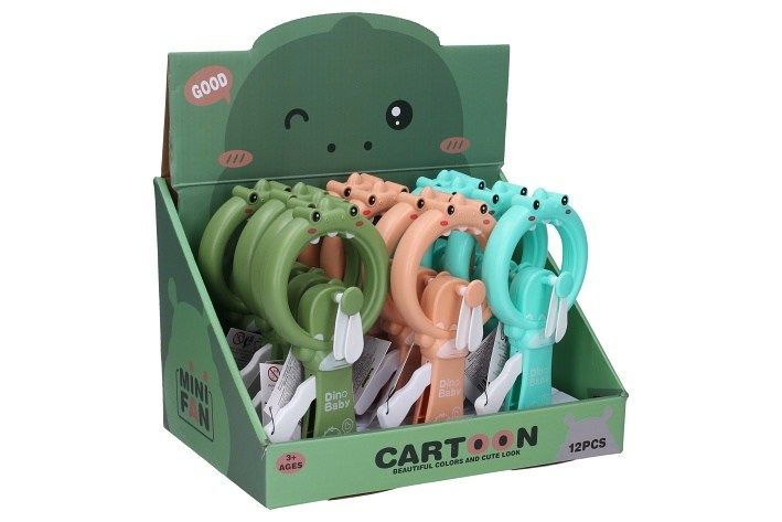 Ruční větráček dino. Přesné rozměry 10x4x18. Větráček se roztáčí manuální páčkou. Display box - 12 cm. 3 varianty - zelená, modrá, červená.
