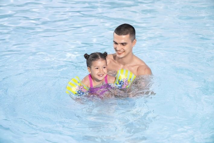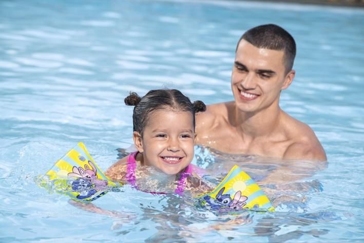 Rukávky plovací Stitch o rozměrech 23 × 15 cm jsou navrženy speciálně pro děti ve věku od 3 do 6 let, aby jim poskytly bezpečnost a jistotu při pobytu ve vodě. Tyto nafukovací rukávky mají veselý motiv populární postavičky Stitch, který je doplněn o svěží barevné pruhy v kombinaci žluté a světle modré barvy. Na přední straně rukávků jsou zobrazeni dva hraví animovaní kamarádi, kteří posilují dětskou radost z vodních her. Rukávky jsou vyrobeny z odolného a hladkého PVC materiálu, který je příjemný na dotek a zároveň dostatečně pevný, aby vydržel časté používání. Každý rukávek je vybaven bezpečnostním ventilem, který umožňuje snadné nafouknutí i vyfouknutí, zároveň však zamezuje nechtěnému úniku vzduchu během plavání. Design rukávků je ergonomicky tvarován tak, aby dobře seděl na dětských pažích a zajišťoval stabilní plavací podporu. V praktických situacích rukávky umožňují dětem zlepšit sebevědomí ve vodě a postupně si osvojit základní plavecké dovednosti. V kombinaci s veselým motivem Stitch a jasnými barvami jsou rukávky atraktivním doplňkem, který děti motivuje k aktivnímu pohybu a bezpečné zábavě ve vodě. Díky svému kompaktnímu rozměru a lehké konstrukci jsou snadno přenosné a ideální pro venkovní aktivity u bazénu nebo na koupališti.