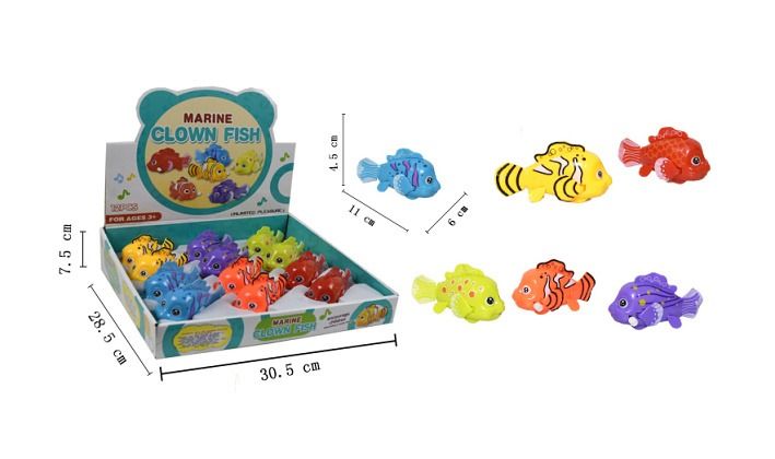 Ryba na natáhnutí. Velikost 11 cm. 12 ks display box. 6 variant - modrá, zelená, žlutá, oranžová, červená, fialová.
