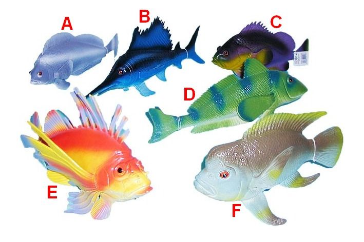 Vyber si svou tropickou rybku! Můžeš vybírat z 6 druhů. Velikosti rybiček se pohybují od 24 do 36 cm.