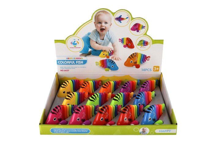 Pestrobarevná rybka na natažení vyrobená z plastu. Veliskot 11 cm.