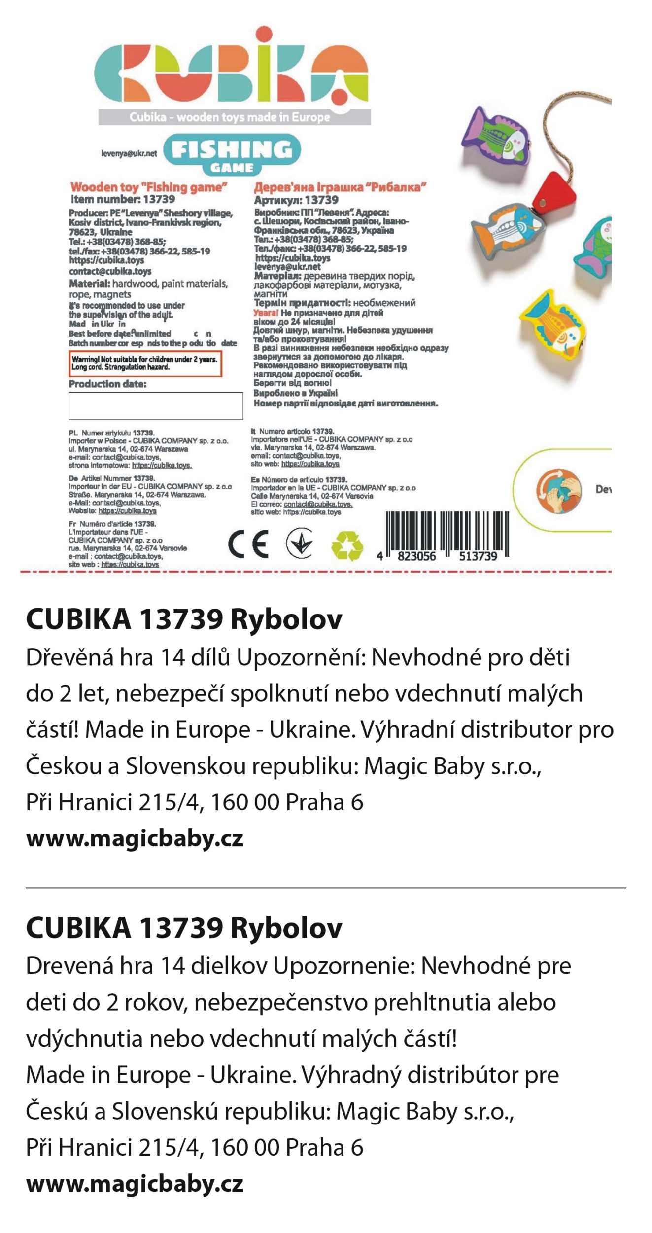 CUBIKA je nová značka dřevěných hraček vyrobených pouze z ekologicky pěstovaného dřeva s velmi precizním opracováním a líbivým designem. Rybolov je známá hra pro děti, jejímž cílem je vylovit co nejrychleji nejvíce rybiček z rybníka. K tomu slouží dva pevné dřevěné pruty opatřené na svých koncích magnetem, protože každá rybička má v sobě zabudovaný kovový plíšek. Rybky pak vyskakují z vody jako živé. Délka prutů 31 cm, délka tkaniček 30 cm. Rybičky ve 3 velikostech: 4,5 x 2x 3 cm, 6 x 2 x 3 cm a 6,5 x 2 x 3 cm. Sortiment hraček značky CUBIKA pomáhá dětem rozvíjet především senzomotorické schopnosti a dovednosti, logické myšlení, kreativitu, představivost a různé poznávací znalosti. Hračky jsou vyrobeny z nejkvalitnějšího javoru a buku a k barvení se používají též vysoce kvalitní barvy na vodní bázi, které jsou naprosto bezpečné pro děti a nemají žádný zápach. Všechny výrobky této značky mají německý certifikát TÜV a jsou vyrobeny dle evropské normy pro bezpečnost hraček EN 71. Nevhodné pro děti do 2 let. Vyrobeno v Evropě.