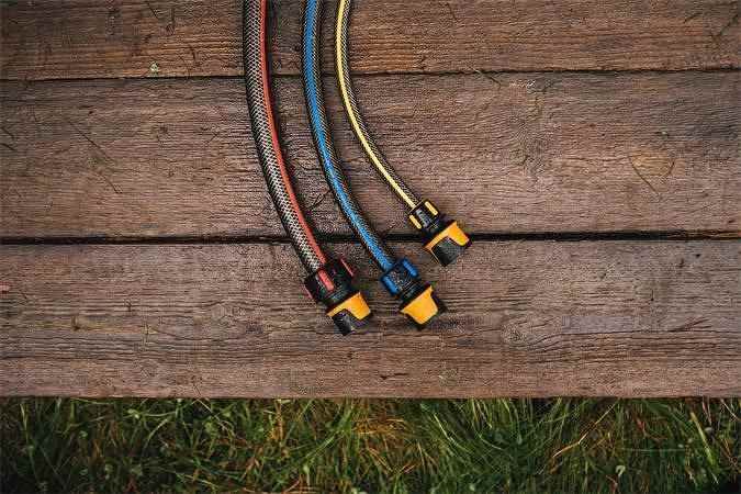 Barevný kódovací systém pro snadné připojení k hadicím Fiskars.