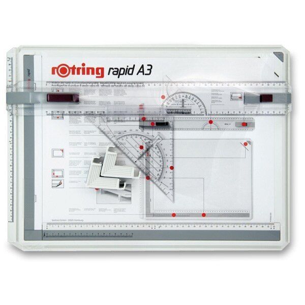 Plně vybavená rýsovací deska velikosti A3 pro rychlou, přesnou a snadnou práci a kufřík pro její bezpečné uložení. Stabilní deska z nelámavého plastu, ergonomické tvary pro pohodlnou práci. Paralelní příložník s aretací, příložník tvaru L umožňuje přesné rýsování podle horní hrany pravítka i v nejspodnější části desky. Dvě magnetické lišty a rohová úchytka pro upevnění výkresu. Lehký posun příložníku vodící drážkou, příložník velikosti A3 s oboustrannou aretací. Dodáváno v kompletu s trojúhelníkem Rapid a párem podpěr.