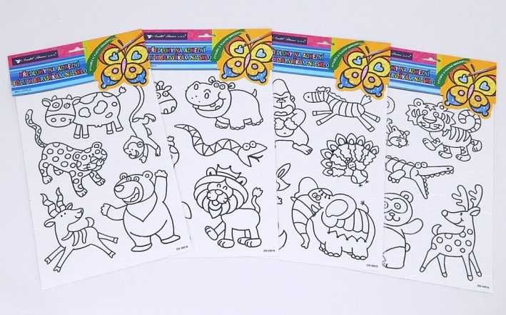 Předlohy na malování na sklo s vyvýšenou konturou zvířátka 37x21cm PŘEDLOHA S VYVÝŠENOU KONTUROU. ADHÉZNÍ FÓLIE ELEKTROSTATICKY PŘILNE K POVRCHU! Vybarvěte a po uschnutí umístěte na čisté, případně navlhčené sklo, zrcadlo, apod... Můžete vybarvit: barvičkami na sklo, fixami, vodovými barvami apod.