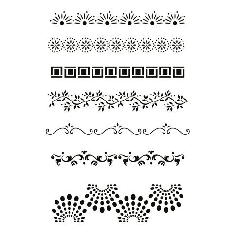 Vytvořte jedinečné motivy s touto plastovou šablonou. Šablona obsahuje různé vzory bordur, které lze snadno přenést na textil, papír, dřevo nebo jiné povrchy. Ideální pro tvorbu triček, tašek či jiných dekorací s použitím textilních či akrylových barev.
