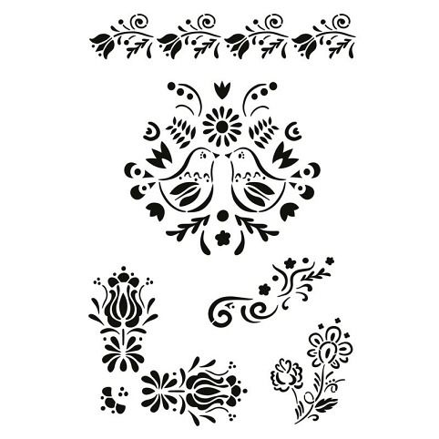 Tato plastová šablona s tradičním lidovým motivem je ideální pro tvoření a dekorace. Motiv zahrnuje symetrické ptáčky obklopené květinovými oranmenty a dalšími přírodními prvky.