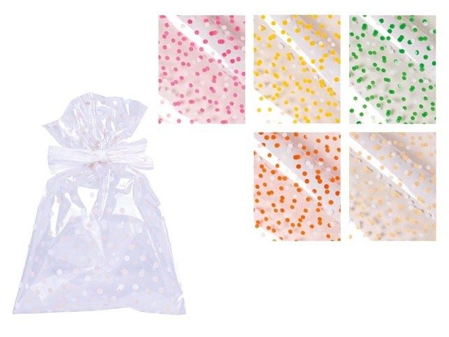 Transparentní čirý celofánový sáček s potiskem barevných puntíků. Skvělý na zabalení drobných dárků. Sáček můžete uzavřít vázací stuhou a tím ho dozdobit. V naší nabídce naleznete velký výběr stužek a rozetek, které Vám pomohou při dekoraci balíčku. Motiv: puntíky Barva: transparentní Rozměr: 200 x 320 mm Uvedená cena je za 1 ks.
