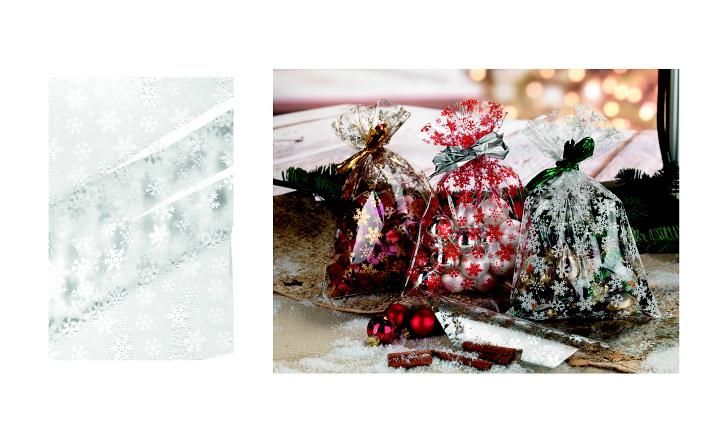 Celofanový sáček o velikosti 25x40 cm Vločky bílé.