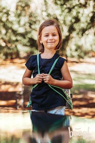 Sáček na cvičky nebo přezůvky. Sáček je vyroben z pevného omyvatelného materiálu. Zdrhování pomocí pevných tkanic, které zároveň umožňují nošení na zádech.