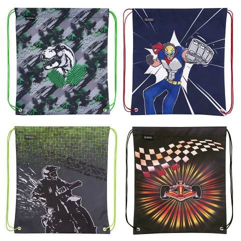 36,5 x 40,5 x 0,5 cm, šňůrka na ramena se zatahování, materiál: polyester, mix motivů: Džungle, Comic, Motokros, Formule