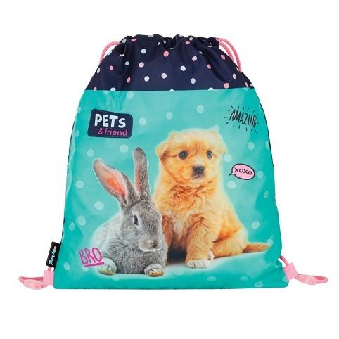 Sáček na přezůvky. Uzavírání stažením šňůrek, možnost nosit i na zádech nebo připevnit ke školnímu batohu. Materiál 100% polyester.