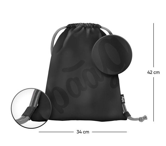 Sáček na cvičky nebo přezůvky v černé barvě s logem Baagl. Zdrhování pomocí pevných tkanic, které zároveň umožňují nošení na zádech.