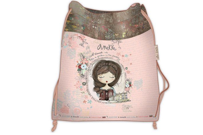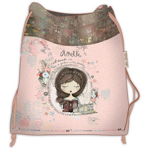 Školní sáček na přezůvky a sportovní potřeby s vnitřní kapsou na zip, potištěné motivem známého děvčátka Anekke z dílny španělské designérky. Kapsa, neboli sáček je skvělý na školní úbor, výtvarnou výchovu, ale i jako menší taštička.