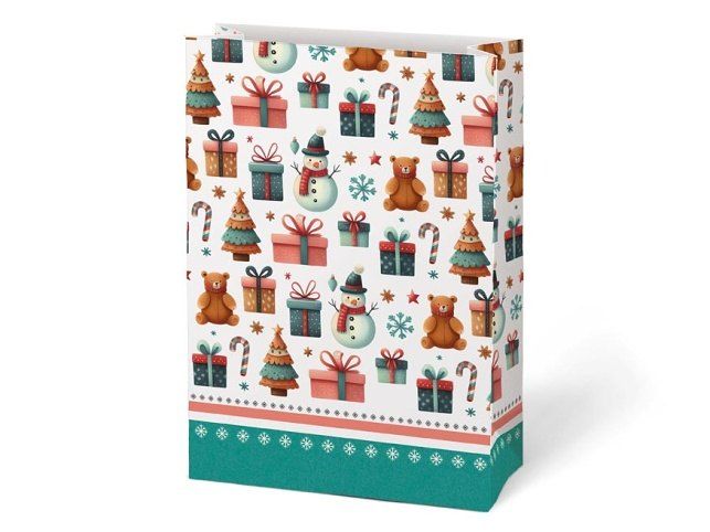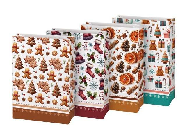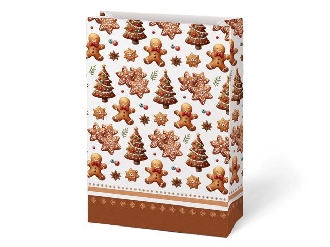 Dárkový sáček v mixu vánočních motivů. Každý motiv je detailně zpracován s důrazem na tradiční vánoční prvky. Sáček je vyroben z pevného kraftového papíru. Tento elegantní dárkový sáček je ideální volbou pro prezentaci vašich vánočních dárků, které získají nádech luxusu. Ideální pro balení menších dárků, sladkostí nebo drobných pozorností. Tento sáček kombinuje praktické využití s krásným designem, což z něj činí ideální volbu pro každého, kdo chce své dárky zabalit rychle, ale přitom vkusně. Balení: 12 ks Gramáž: 120 g Materiál: kraftový papír Rozměr: 260 x 360 x 120 mm Motiv: perníčky a vánoční stromky, vánoční ponožky a čepice, sušené ovoce a koření, vánoční dárky a medvídci Uvedená cena je za 1 ks.