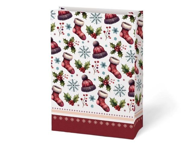 Dárkový sáček v mixu vánočních motivů. Každý motiv je detailně zpracován s důrazem na tradiční vánoční prvky. Sáček je vyroben z pevného kraftového papíru. Tento elegantní dárkový sáček je ideální volbou pro prezentaci vašich vánočních dárků, které získají nádech luxusu. Ideální pro balení menších dárků, sladkostí nebo drobných pozorností. Tento sáček kombinuje praktické využití s krásným designem, což z něj činí ideální volbu pro každého, kdo chce své dárky zabalit rychle, ale přitom vkusně. Balení: 12 ks Gramáž: 120 g Materiál: kraftový papír Rozměr: 260 x 360 x 120 mm Motiv: perníčky a vánoční stromky, vánoční ponožky a čepice, sušené ovoce a koření, vánoční dárky a medvídci Uvedená cena je za 1 ks.