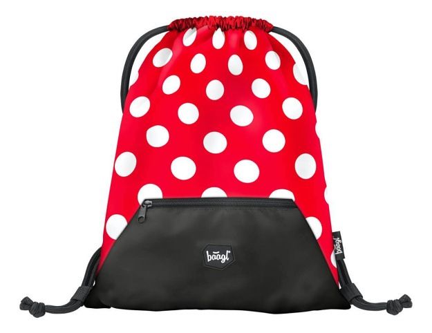 Sáček na cvičky nebo přezůvky. Sáček je vyroben z pevného omyvatelného materiálu a v jeho dolní části je umístěna praktická kapsa na zip. Zdrhování pomocí pevných tkanic, které zároveň umožňují nošení na zádech.