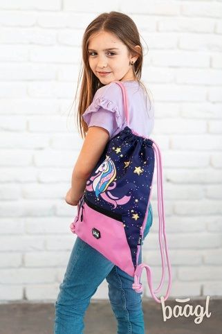 Sáček na cvičky nebo přezůvky. Sáček je z pevného omyvatelného materiálu a v jeho dolní části je umístěna praktická kapsa na zip. Zdrhování pomocí pevných tkanic, které zároveň umožňují nošení na zádech.