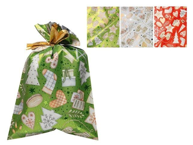 Vánoční dárkový sáček vyrobený z lesklého materiálu s dekorativním potiskem vánočních motivů. Umožňuje snadno zabalit různé druhy drobných dárků bez nutnosti použití balicího papíru. Praktický a elegantní způsob balení, který šetří čas i námahu. Sáček můžete uzavřít vázací stuhou a tím ho dozdobit. Motiv: vánoční Materiál: polypropylen Rozměr: 160 x 250 mm Barva: zelená, bílá, červená Uvedená cena je za 1 ks.