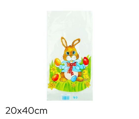 Sáček na nadílku s velikonočním motivem- složené dno má hloubku 6cm- potisk na přední straně- fólie je určena pro přímý styk s potravinami, zdravotně nezávadná- každý sáček je opatřen čárovým kódem- rozměr: 20 x 40cm