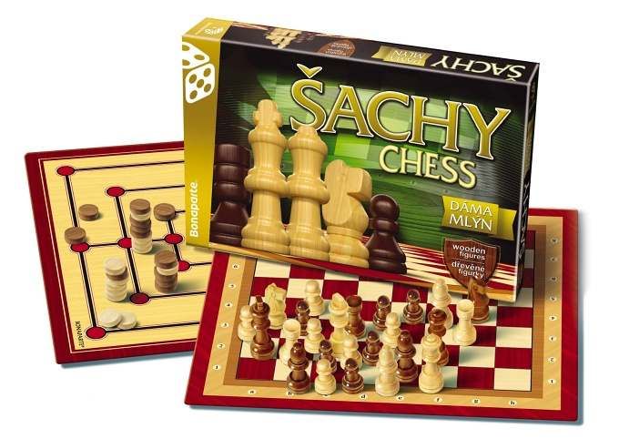 Šachy, dáma, mlýn společenská hra v krabici 35x23x4cm