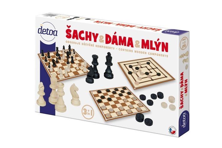 Set obsahuje oboustranný herní plán šachovnici a plán pro hru mlýn,