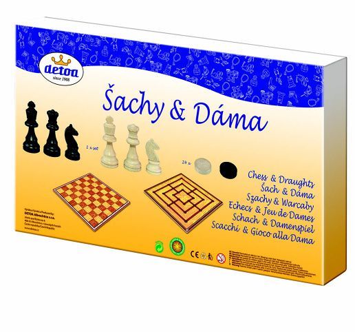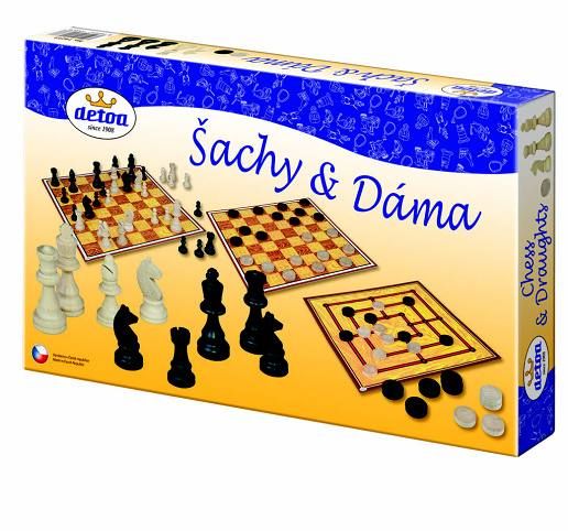 Set obsahuje oboustranný herní plán šachovnici a plán pro hru mlýn, vyroben z papíru. Šachové figurky (typ Steuton) i dámové kameny jsou ze dřeva. Výška krále 74mm.