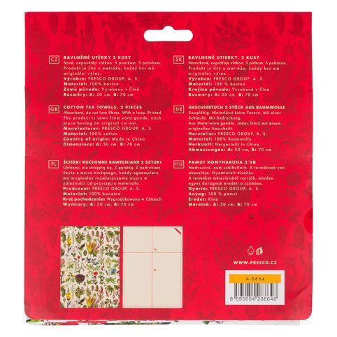 Sada dvou vzorovaných kuchyňkých utěrek ze 100% bavlny. Utěrky lze prát v pračce a na jejich horní straně je umístěné poutko. Utěrky jsou šité z metráže, každý kus má originální výřez potisku.