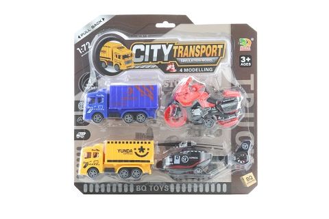 Sada 4 dopravních prostředků (2x kamion, motorka a vrtulník). Materiál plast. Rozměr cca 11,5 cm (dle typu). Rozměr balení cca 28 x 29 x 4,5 cm. Věk3+