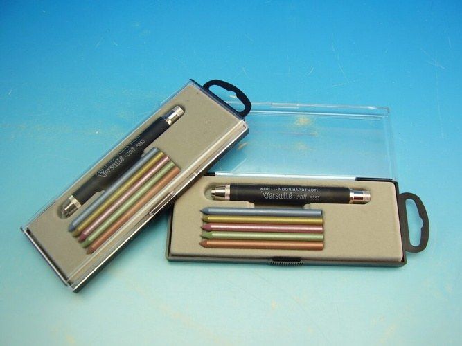 Tužka mechanická 5,6 5353 černá. Souprava mechanické padací tužky, kovové, s povrchem se soft efektem a stříbrnou tuhou pr. 5,6 mm a sady 5 barevných tuh. Souprava je určená pro běžné psaní i kreslení. Tuha v tužce se posunuje stisknutím knoflíku v nakloněné poloze tužky, tím dojde k otevření kleštiny a vysunutí tuhy. V knoflíku je umístěno hrotítko, po odšroubování knoflíku lze hrotit tuhu. Plášť tužky černé barvy je kruhového profilu pr. 12,mm. Tužka vzhledově vypadá jako pogumovaná, nemá klip. Tužka je vložena do tvarové vložky, vedle tužky je 5 tuh pr. 5,6 mm v barvě metalízy bronzové, modré, zelené, zlaté a růžové, vše je v plastovém pouzdru s transparentním víkem.