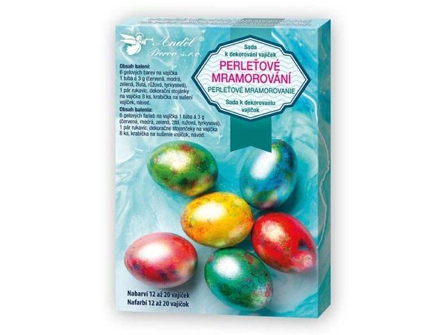 Sada k dekorování vajíček - perleťový mramor - nabarví 12 - 20 vajíček. Obsah balení: 6 gelových barev na vajíčka á 3 g (červená, modrá, zelená, žlutá, růžová, tyrkysová), 1 pár rukavic, dekorační stojánky na vajíčka 8 ks, krabička na sušení vajíček, návod. Návod na barvení a zdobení vajíček: Před barvením doporučujeme vajíčka umýt v roztoku jedlé sody (2 polévkové lžíce sody na 1 litr vody). 1. Připravte si pracovní podložku, hrnek, polévkovou lžíci a papírové ubrousky. 2. Uvařte vajíčka a ponechte je v horké vodě (50-70°C). Vybranou tubu s barvou špičkou nahoru na 1 mminutu vložte do hrnku s horkou vodou, aby se barvivo rozpustilo. Pomocí lžíce vyndejte vajíčko z horké vody a osuště. 3. Nasaďte si rukacive a protřepte tubu s barvou, poté pro její otevření nůžkami odstřihněte špičku. 4. Na vajíčko naneste pár kapek barvy. Pro rovnoměrné a důkladné barvení by vajíčka měla být horká a suchá. 5. Poválejte vajíčko v dlani a poté jej nechejte uschnout v sušáku. Z 1 tuby je možno obarvit 3-5 vajíček. 6. Vyloupnutím perforace na zadní straně krabičky získáte sušák na vajíčka.
