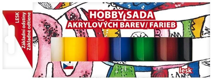 HOBBY SADA AKRYLOVÝCH BAREV - LESKLÁ. Můžete ji použít na papír, dřevo, keramiku, plast, kov nebo ubrouskovou techniku. Vhodná je i na kamínky. Barvy mají vynikající krycí schopnost a jsou vodou ředitelné.Jsou vhodné pro vnitřní i venkovní použití. Sada obsahuje: 7 barev v lahvičkách po 15 gramechBarvy: bílá, žlutá, červená, modrá, zelená, hnědá, černá.2 ks šablon na malování. Návod: Naneste na suchý a čistý povrch.Po zaschnutí je barva lesklá a voděodolná.Případné další vrstvy nanášejte až po zaschnutí.Nakonec je možné přelakovatakrylovým lakem. Vyhovují vám barvy z této sady? Můžete si dokoupit celou řadujednotlivých odstínů! V nabídce máme lesklé, matné a metalické. Vyrobeno v České republice.