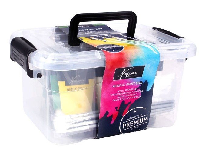 Sada akrylových barev Nassau Fine Art v praktickém úložném plastovém boxu. Vydatné akrylové barvy na malování na plátno a jiné druhy povrchů. Koncentrované a pevné pigmenty obsažené v barvách se snadno mezi sebou spojují a vytvářejí nekonečné množstvo odstínů. Mohou být použity např. pro mixed media techniku ve spojení s akvarelem, strukturovacími pastami a gely, po zředění na airbrush a grafický tisk. Sada obsahuje i 6 štětců určených speciálně pro akrylové barvy, kterými docílíte široké spektrum uměleckých efektů. Barvy jsou po vysušení trvanlivé, voděodolné a pružné. Jsou ideální pro začátečníky a i pro pokročilé. Sada obsahuje 15 dílů – 9 × 75 ml akrylová barva (primary red, primary blue, primary yellow, green, burnt umber, yellow oxide, mars black, 2 x titanium white), 6 x štětec (1 x vějířovitý č. 6, 3 x plochý č. 2, 3, 6 a 2 x kulatý č. 1 a č.4).