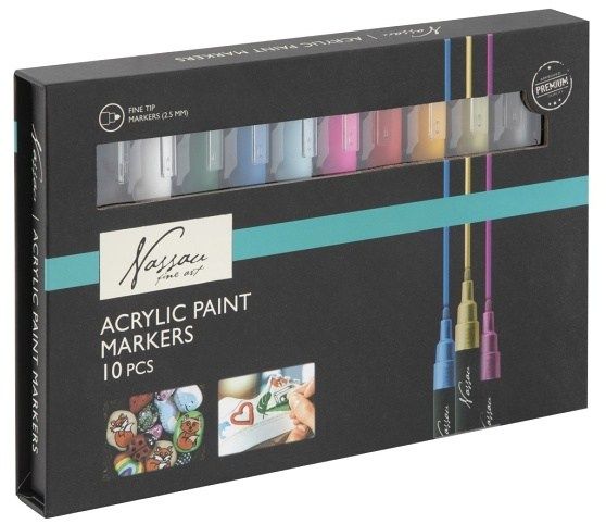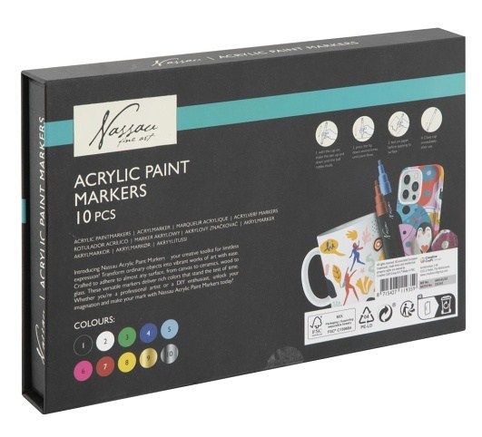 Sada akrylových fixů – přeměňuje obyčejné předměty v neobyčejné. Jsou vytvořené tak, aby drželo skoro na každém povrchu – na plátně, keramice, dřevu, skle i plastu. Tyto univerzální akrylové fixy dodávají bohatou barevnost na dlouhou dobu (stálobarevné). Sada obsahuje 10 akrylových fixů.