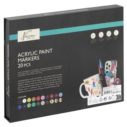 Sada akrylových fixů – přeměňuje obyčejné předměty v neobyčejné. Jsou vytvořené tak, aby drželo skoro na každém povrchu – na plátně, keramice, dřevu, skle i plastu. Tyto univerzální akrylové fixy dodávají bohatou barevnost na dlouhou dobu (stálobarevné). Sada obsahuje 20 akrylových fixů.
