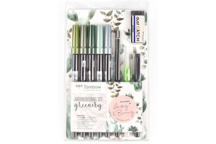 balení - oboustranné fixy ABT Dual Brush Pen se dvěma hroty: 098, 228, 249, 312 a N52, vodní štětec Water Brush pro malování fixy ABT Dual Brus Pen na vodní bázi, fineliner MONO drawing pen pro kreslení přesných linek a obrysů, tužka MONO 100 pro kreslení pomocných linek, pryž MONO dust CATCH pro čisté a přesné gumování pomocných linek