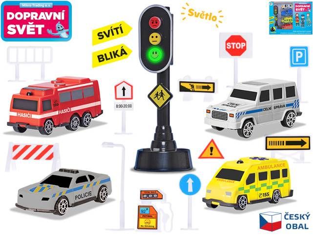 Sada aut 4ks 7cm s dopravními značkami a semaforem na baterie se světlem v krabičce