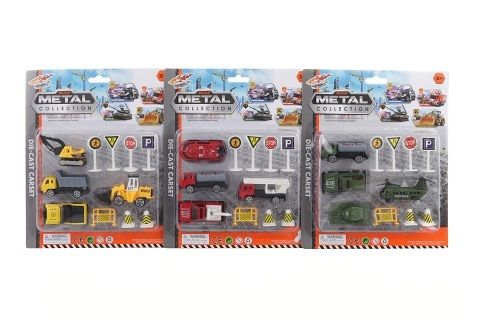Sada kovových aut se značkami. Značky z plastu. Více druhů, dodáváme dle skladové dostupnosti. Rozměry balení cca 21x26x3 cm. Věk 3+