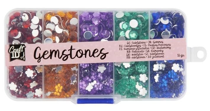 Sada krásných barevných drahokamů v 5 barvách a 2 tvarech (diamanty ve tvaru čtverce a srdíčka) – celkově tedy 10 různých dekorativních kamínků. Baleno v praktickém plastovém pořadači.