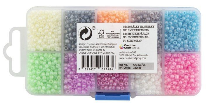 Krásná sada korálků obsahuje 10 druhů různých barev korálků, korálky jsou baleny v praktickém plastovém pořadači, 15 gramů korálků každé barvy, celkově 150 gramů korálků