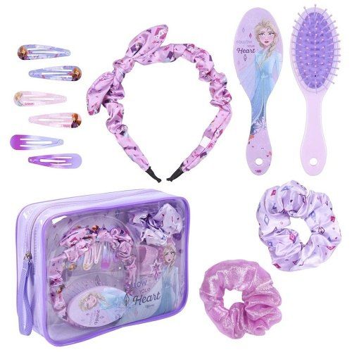 Dárkové balení – sada beauty do vlasů Ledové království 2. Sada obsahuje 6 kovových sponek do vlasů s aplikací, čelenku s mašlí, kartáč a dvě saténové gumy do vlasů. V praktické taštičce na zip.