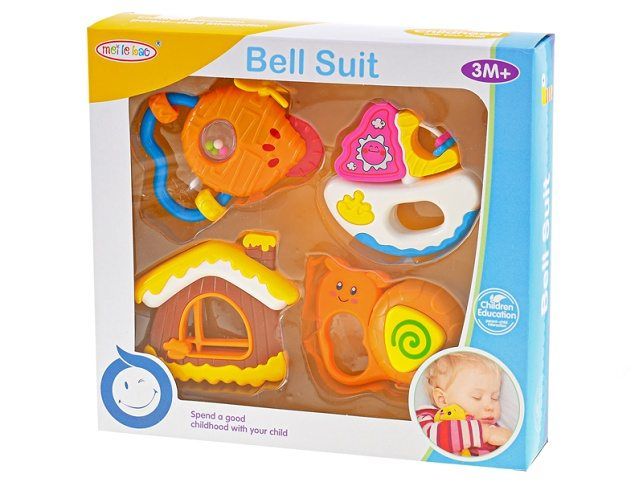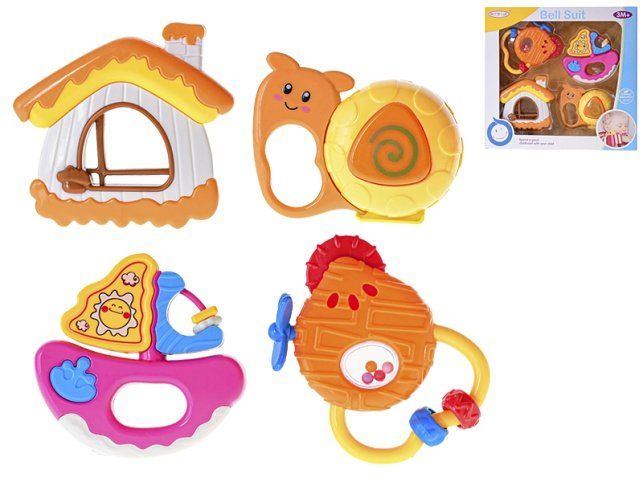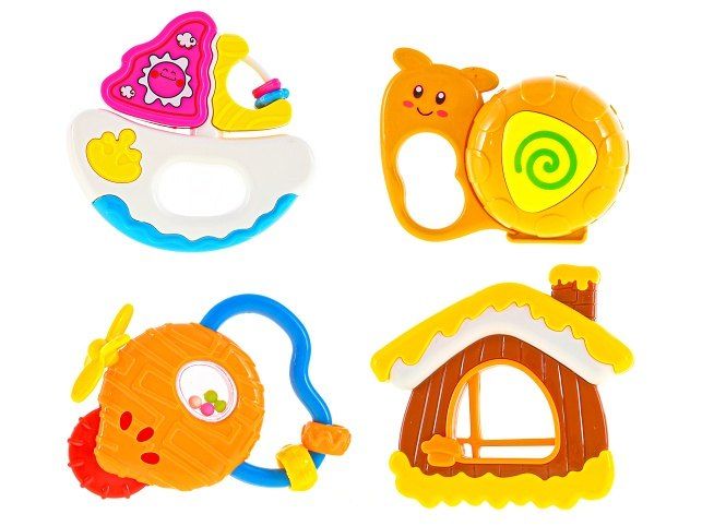 Sada krásných barevných chrastítek o velikosti 10 - 13 cm. Balení obsahuje 4 ks, které jsou vhodné pro chlapečky i holčičky od 3 měsíců.