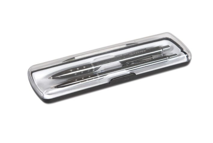 Dárková sada v plastové krabičce obsahuje kuličkové pero 0,7mm a mechanickou tužku 0,5mm. Lesklé tělo z eloxovaného hliníku a pochromovanými doplňky v šedé barvě. Náhradní plastová náplň A3 modrá.