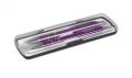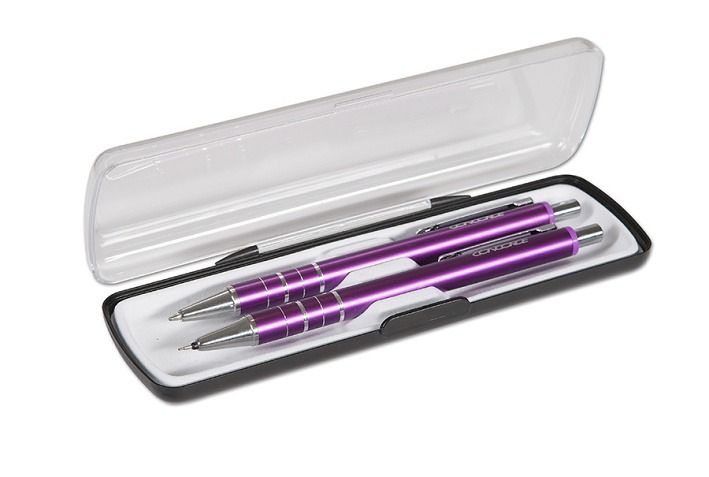 Dárková sada v plastové krabičce obsahuje kuličkové pero 0,7mm a mechanickou tužku 0,5mm. Lesklé tělo z eloxovaného hliníku s kovovým klipem. Náhradní plastová náplň A3 modrá. Dodávaná v barvě fialové.