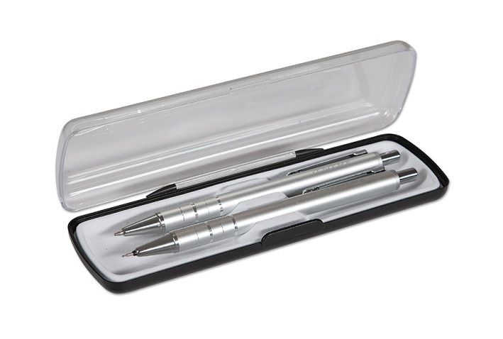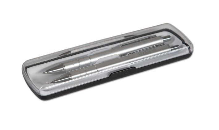 Dárková sada v plastové krabičce obsahuje kuličkové pero 0,7mm a mechanickou tužku 0,5mm. Lesklé tělo z eloxovaného hliníku s kovovým klipem. Náhradní plastová náplň A3 modrá. Dodávaná ve stříbrné barvě.