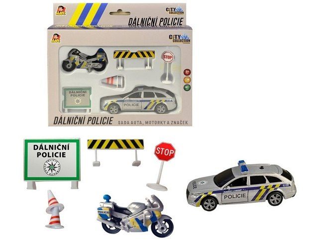 Sada dálniční policie v českém designu. Znáte z našich silnic. Policejní auto (kov), motorka (plast), značky (plast) z produktové řady City Collection. Auto s funkčním majákem (světlo, zvuk). Skvělá hračka pro malé ochránce. S takovým vybavením bude každý pirát silnic okamžitě zadržen. Pohon na zpětné natažení Délka motorky: 7 cm Délka auta: 12 cm. Český desgin. Český box. Vhodné pro děti od 3 let.