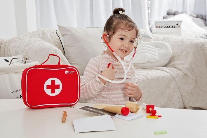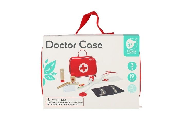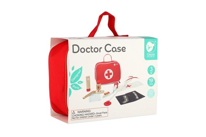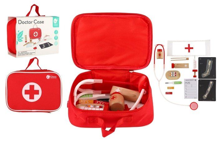 Vše, co potřebuje doktor najedete v tomto setu. Stačí si vzít stetoskop (plastový) a můžete začít léčit. V sadě je spousta dřevěných doplňků, aby hra byla zajímavější a dokážete tak vyléčit každou bolístku. Sada obsahuje 19 ks.