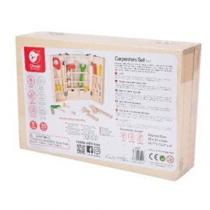 Tato sada obsahuje různé druhy nástrojů včetně kladiva, pily, šroubováků, pravítka, prken, šroubů a šroubů. Pouzdro má uvnitř 2 zásuvky a 6 polic, do kterých snadno umístíte veškeré své nářadí. Pokud zavřete kufřík pomocí svorek, můžete si ho vzít s sebou kamkoli jdete!