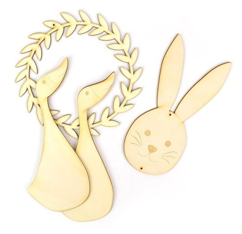 4 ks dřevěných výřezů s jarními motivy: jarní věneček, hlava zajíce, dvě husy,